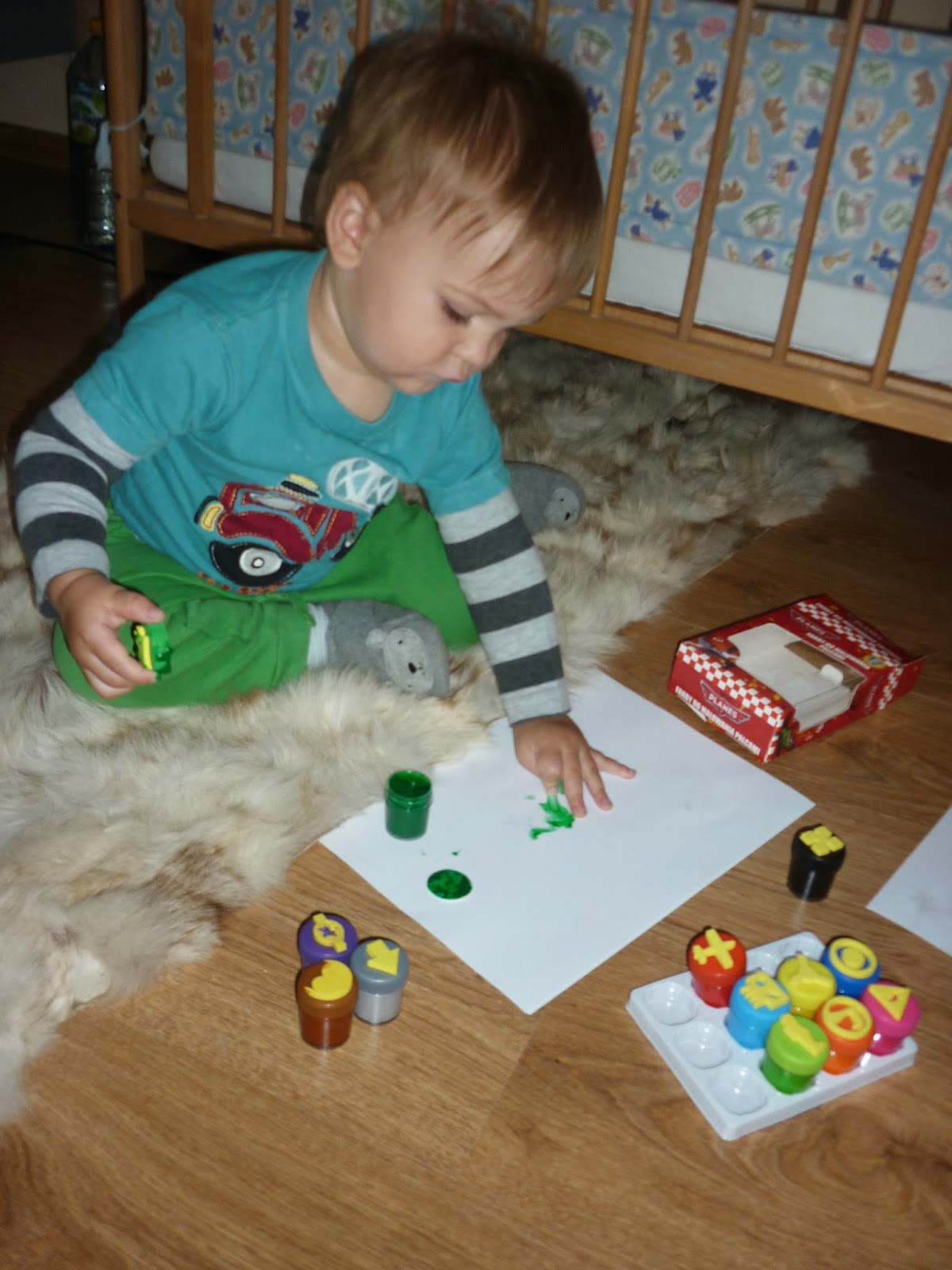 Farby okazały się hitem (co prawda pieczątki nie do końca odbijają się tak super), ale dla Nataniela najlepszą frajdą jest maczanie paluszków w farbie i robienie swoich malowideł ;)
